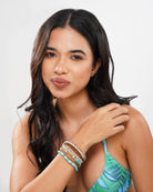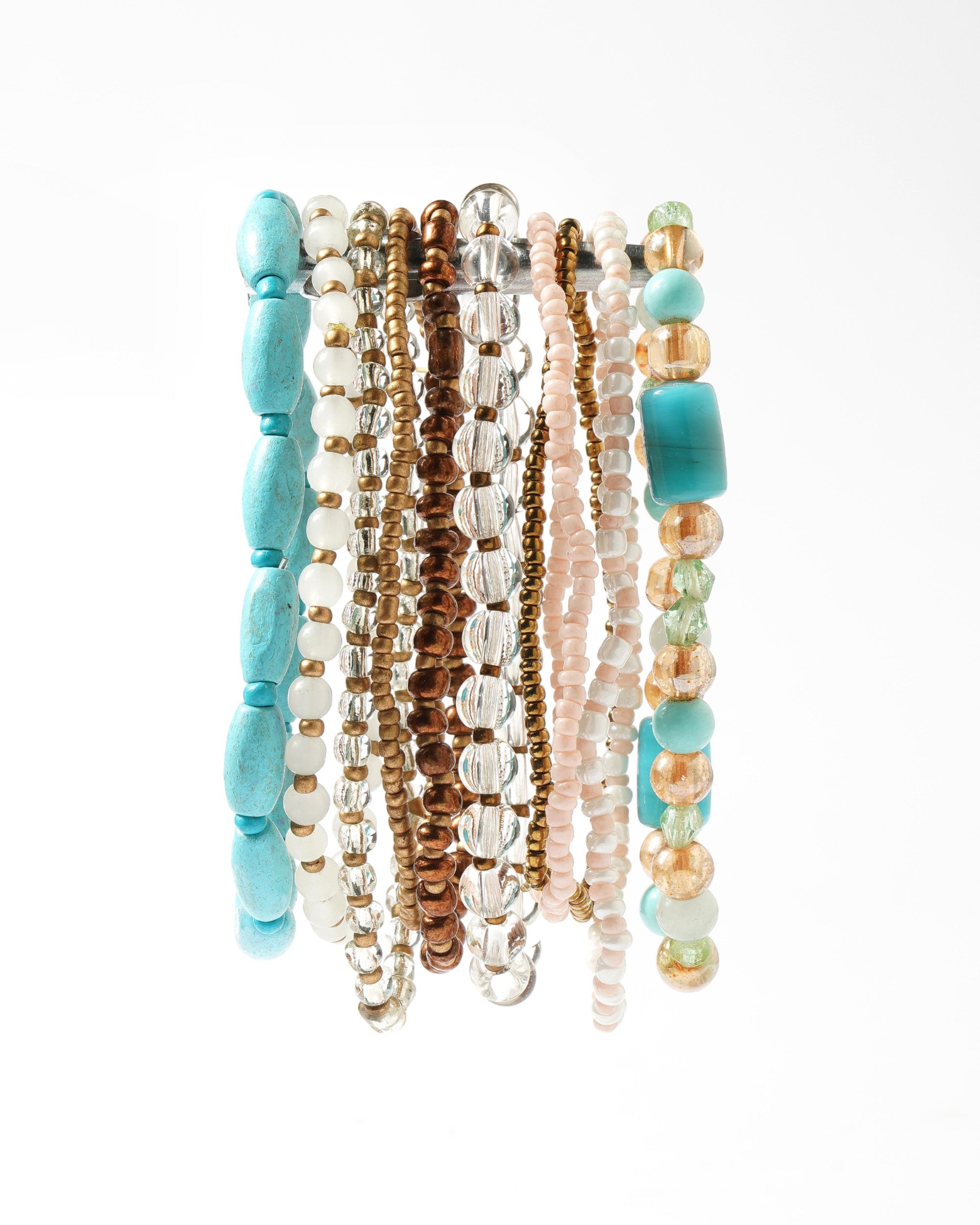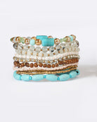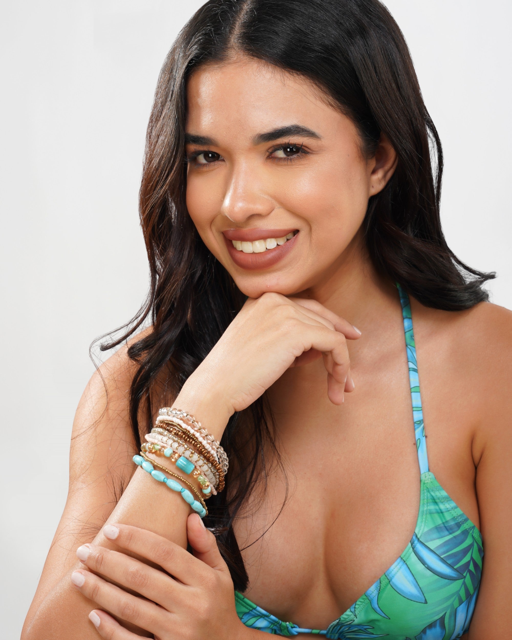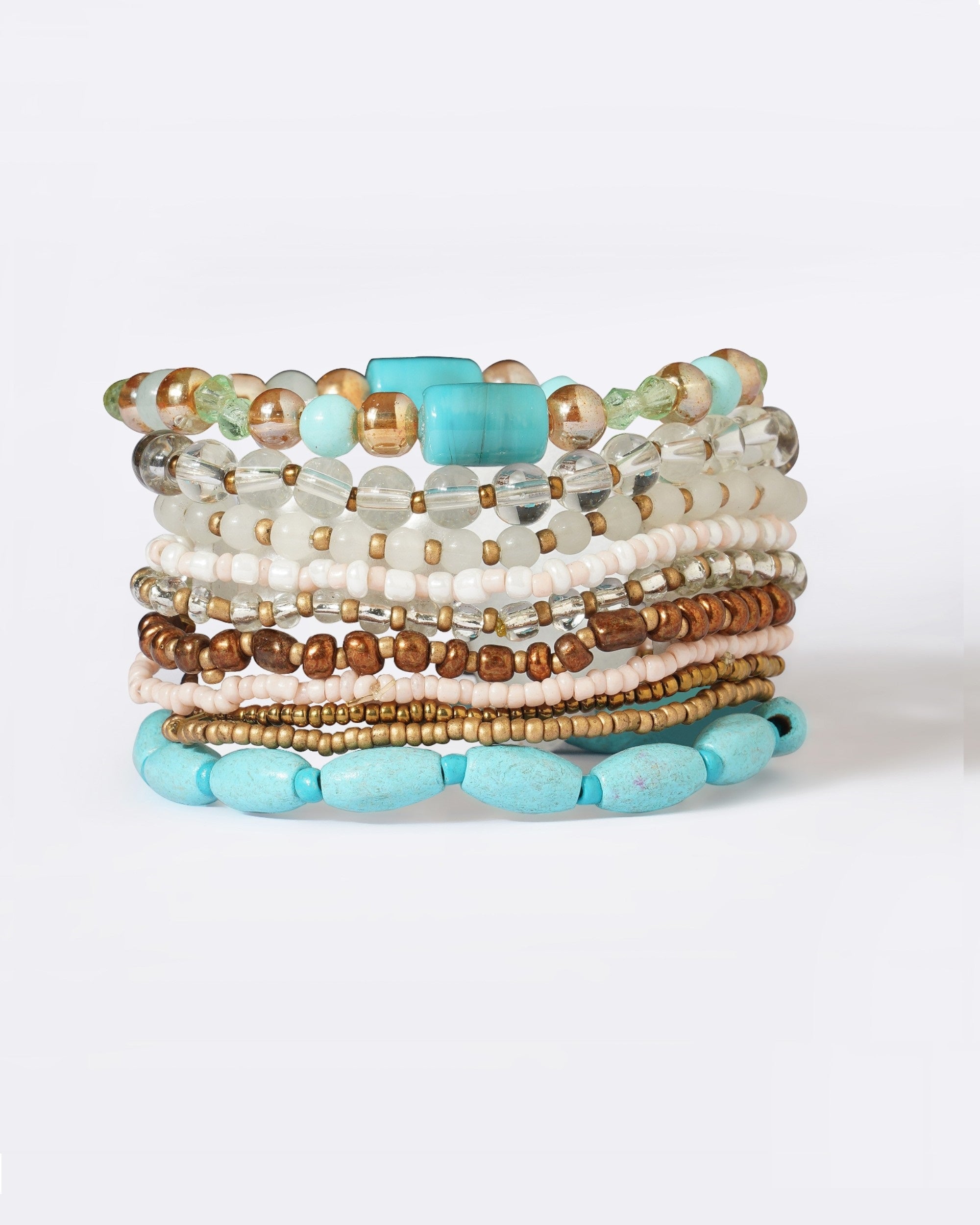 This Mixed Bead Bracelet Set enhances your summer vibes! Ten strands of stunning glass beads, turquoise blue/silver beads, and gold beads elevate your beach-going style. The set includes 10 bracelet strands with an elastic band stretch that fits most wrist sizes. These bracelets are perfect for both casual and formal events, and can be worn together or separately to create a versatile and unique look. Get yours and let your fashion sense shine!