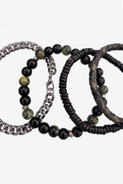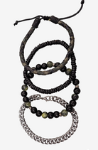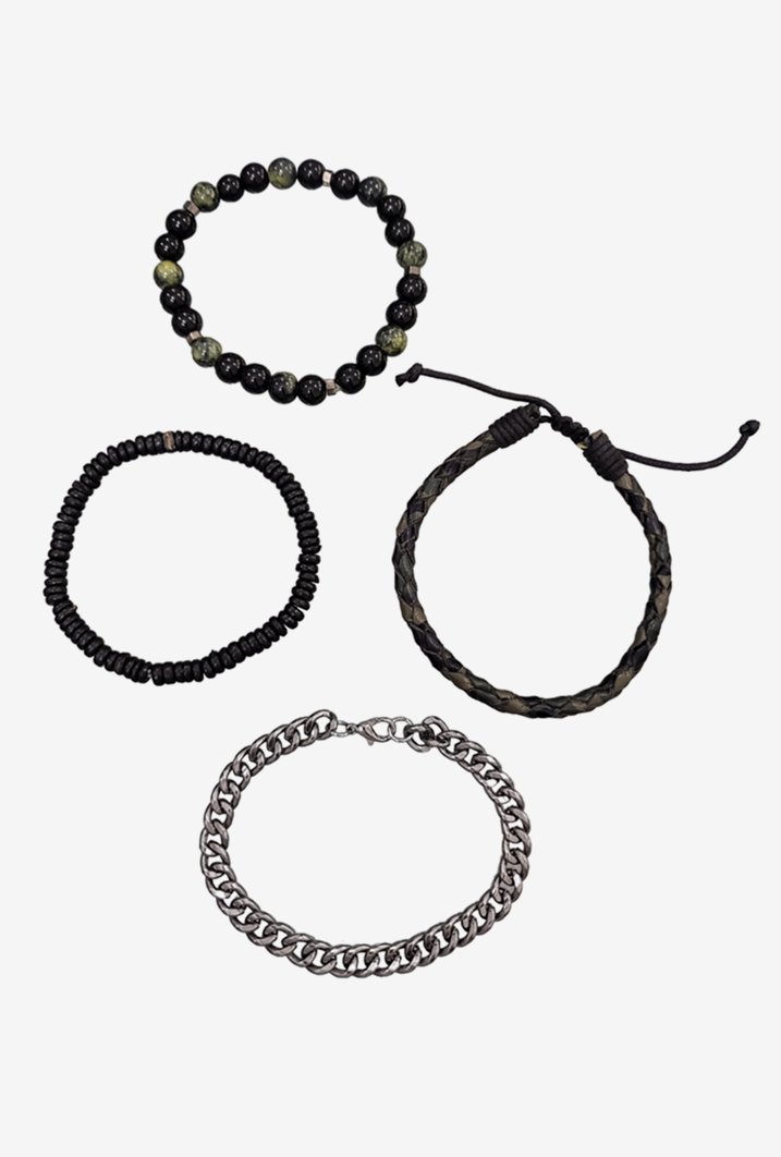 This 4-pack includes a metal chain bracelet with lobster closure, a black wooden elasticated bracelet, a glass bead elasticated bracelet, and a leather cord bracelet with adjustable closure.