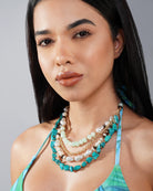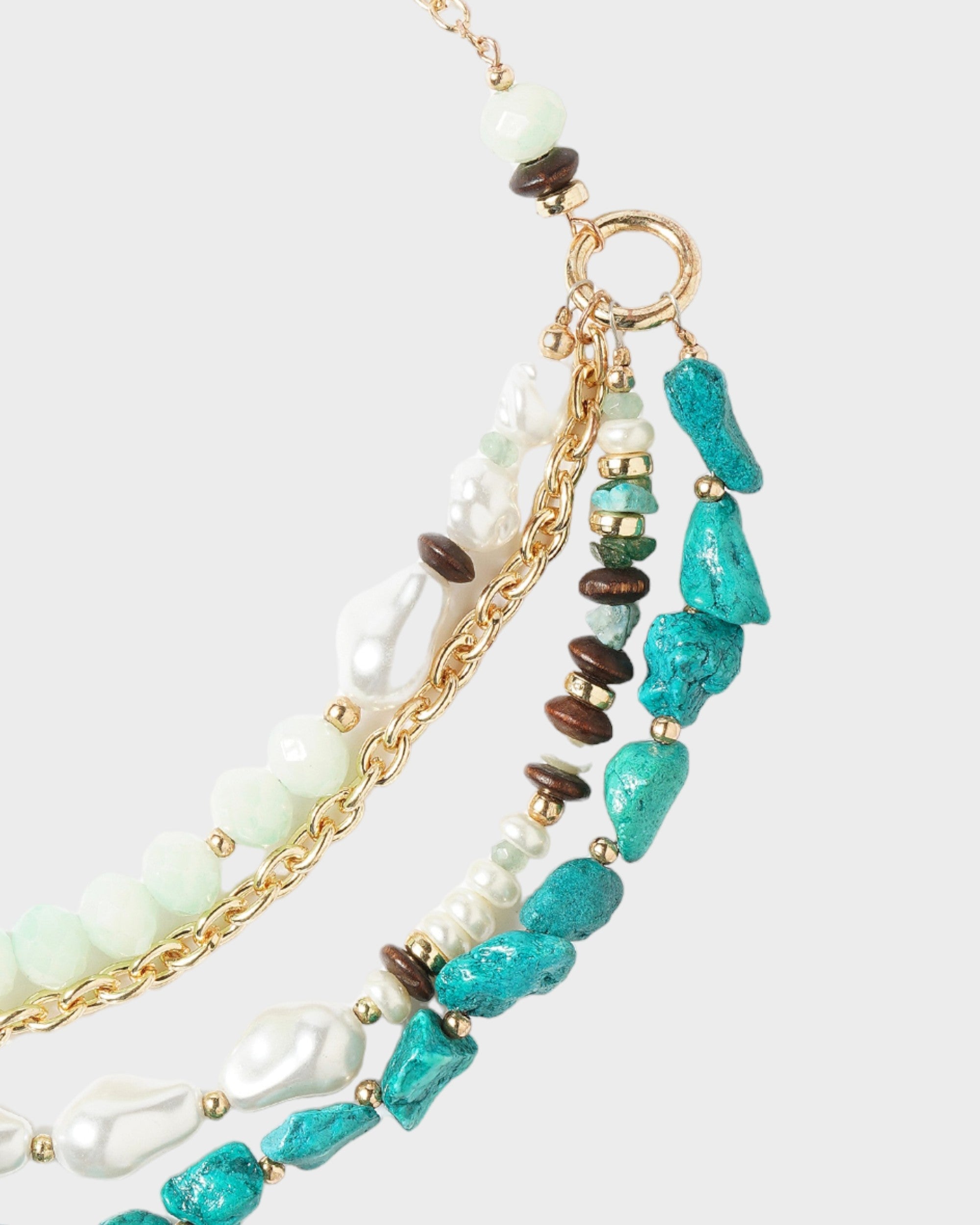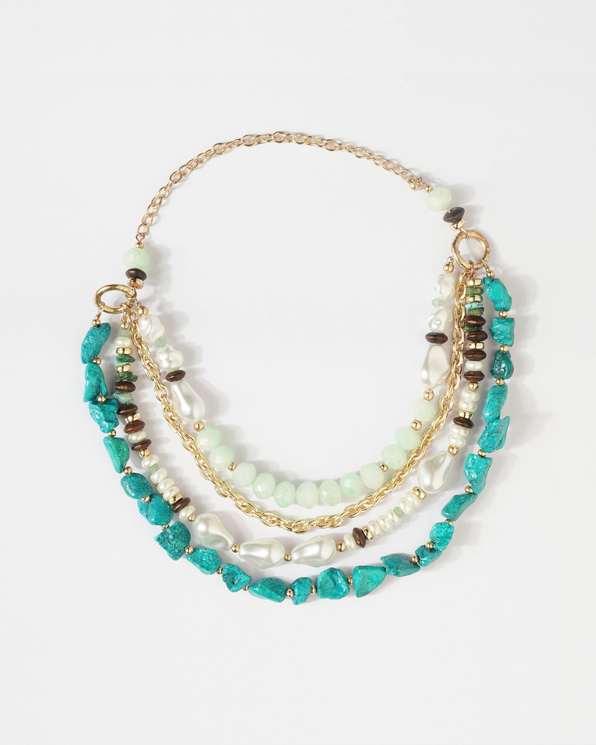 Expertly crafted with a combination of vibrant turquoise clay stones,wood beads and elegant pearls, this layered necklace features diverse shapes and sizes that add a touch of sophistication to any outfit. Finished off with gold-tone accents and a secure lobster clasp closure, it is the perfect accessory for elevating your style this season.