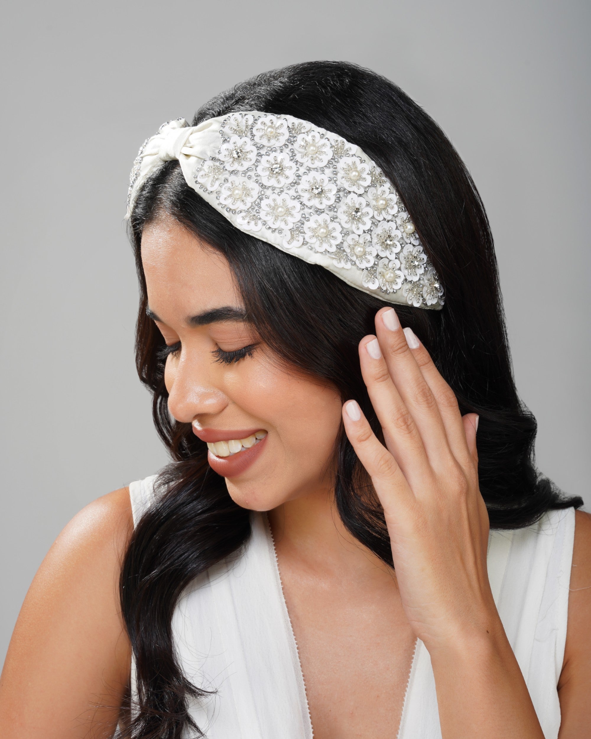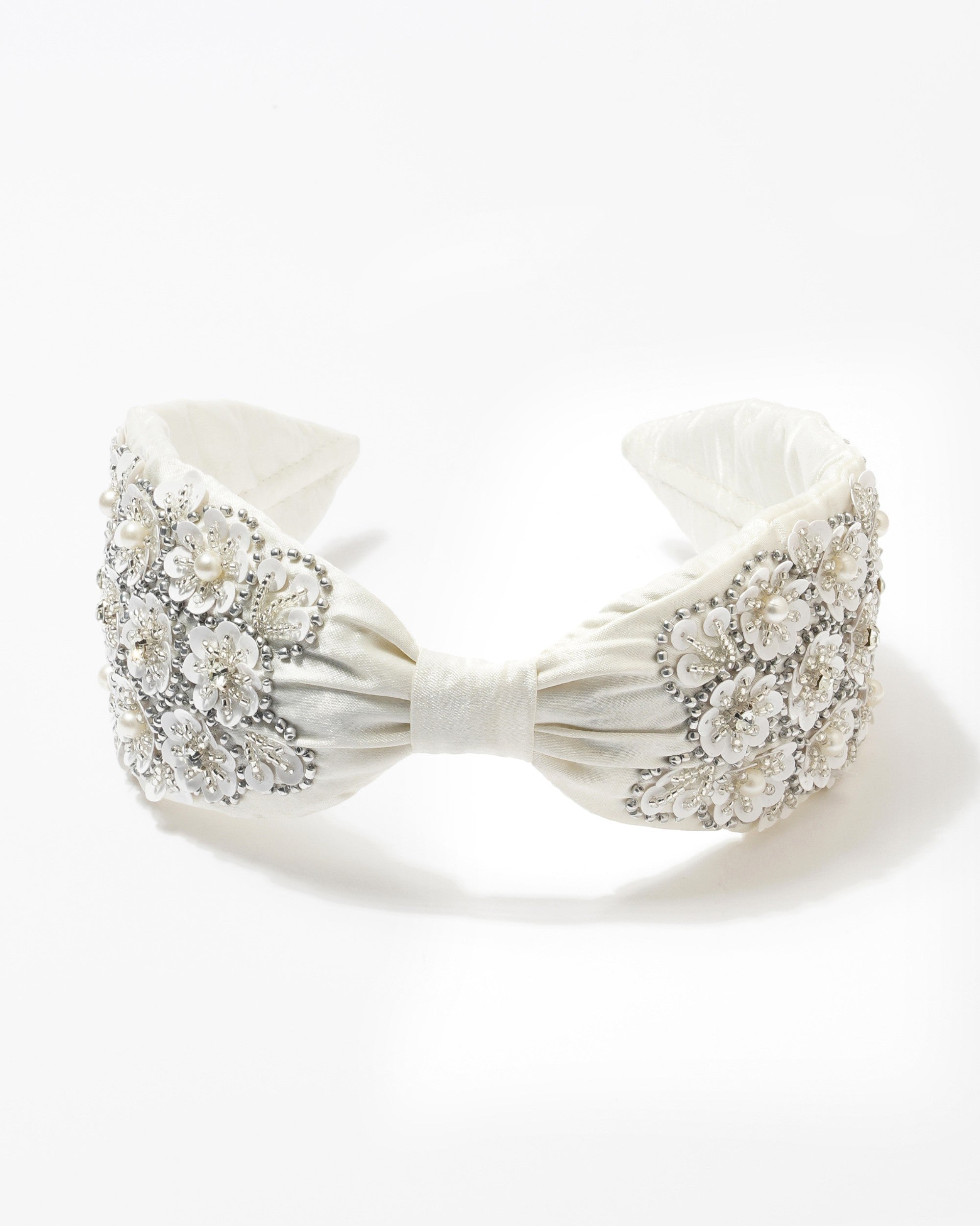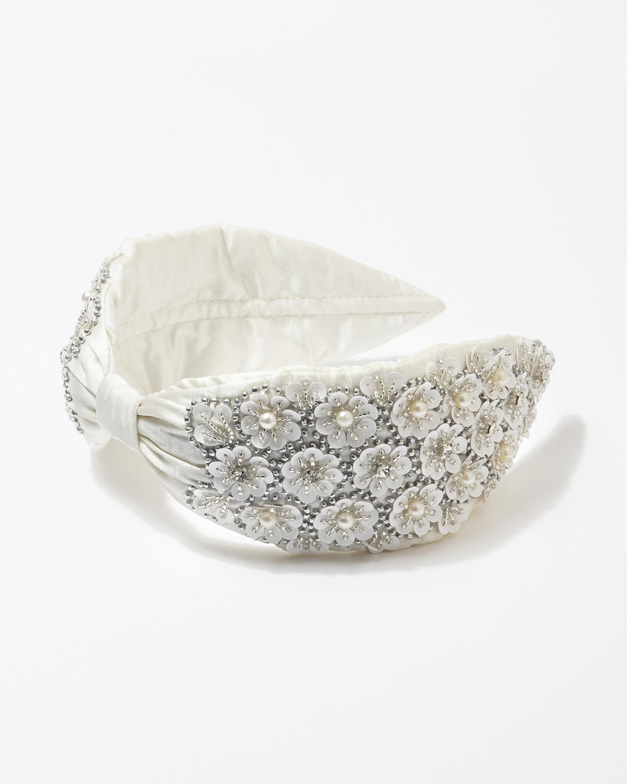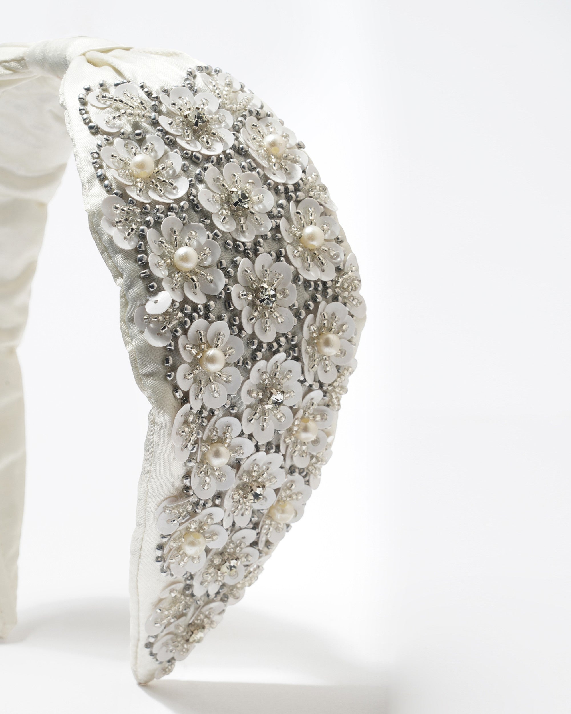Elevate your style with this stunning handcrafted headband made from luxurious white silk, featuring a delicate flower design that adds a touch of elegance to any outfit. Perfect for special occasions or just to brighten up your everyday look, this headband is both chic and comfortable, making it a must-have accessory for fashion lovers.